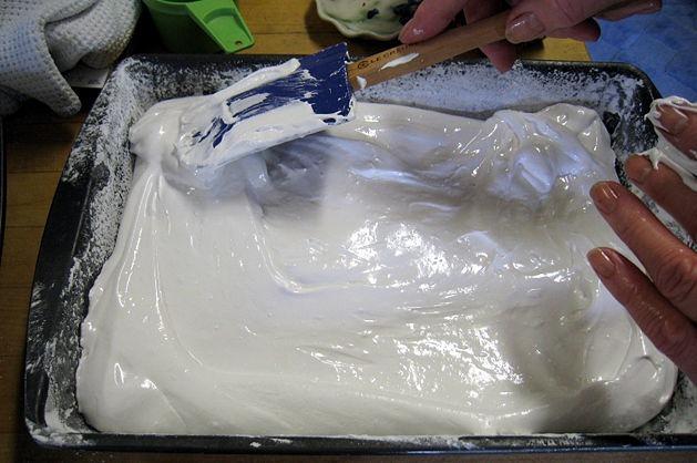 Espolvorea más maicena en la pare superior. Deja que los malvaviscos se asienten alrededor de 4 horas a temperatura ambiente. Esparce la mezcla uniformemente en el molde preparado, la bandeja.