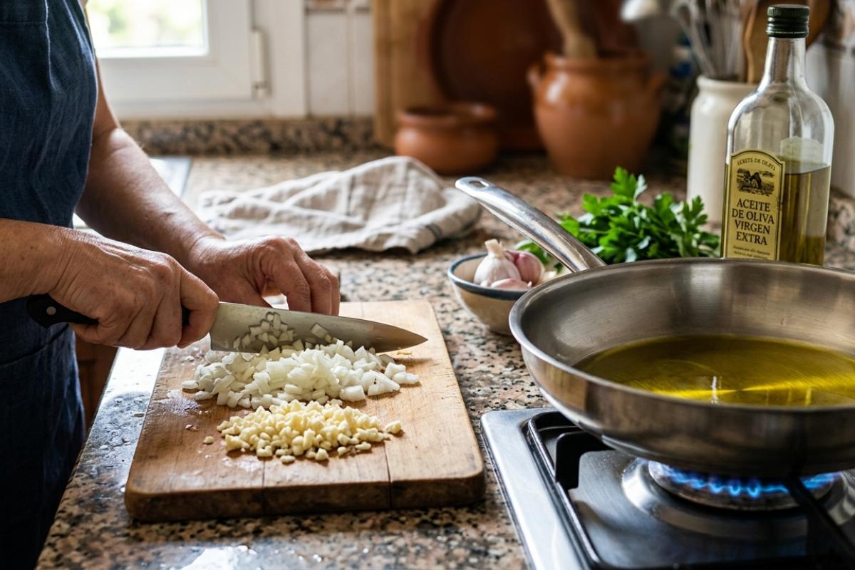 Para preparar la salsa marinera, pela y pica finamente la cebolla y los ajos. En una sartén amplia, añade un buen chorro de aceite de oliva y caliéntalo a fuego medio.