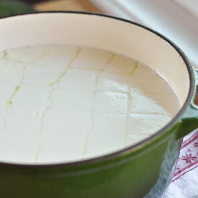 Después de cinco minutos, la leche debe verse y sentirse blanda. Si todavía está muy líquida, tapa la olla y deja reposar por cinco minutos. Una vez que se establece la leche, la cuajada se corta uniformemente: tienes que hacer varios cortes paralelos verticalmente a través de la cuajada y luego varios cortes paralelos horizontalmente, creando una red como patrón. Asegúrate de que el cuchillo llega a todo el camino hasta el fondo de la olla. Coloca la olla de nuevo en la cocina a fuego medio y calienta la cuajada. Revuelve lentamente a medida que la cuajada caliente, pero trata de no separarlas demasiado. La cuajada con el tiempo se agrupa y separa de forma más completa del suero de color amarillo.