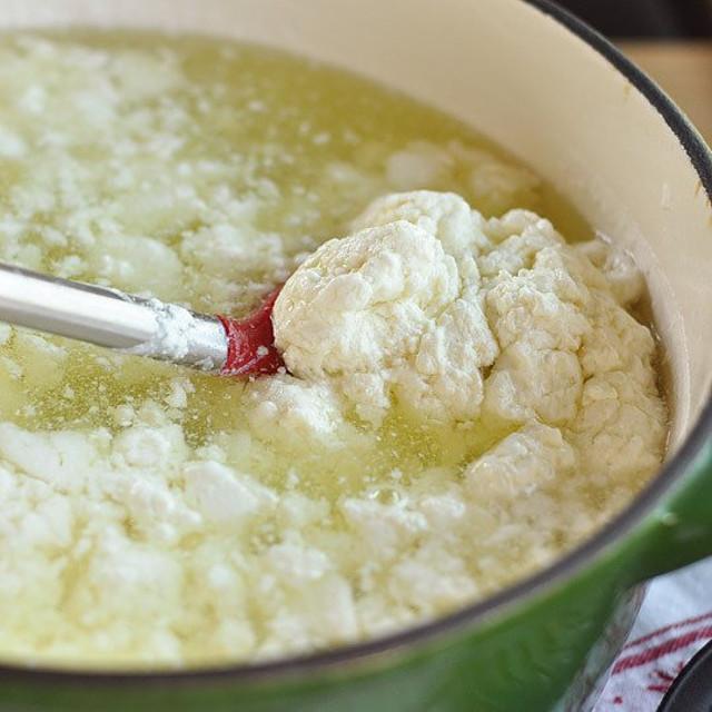 Lleva la cuajada al microondas durante 1 minuto. Escurre el suero. Dobla la cuajada sobre sí mismas varias veces. En este punto, la cuajada seguirá siendo muy floja.