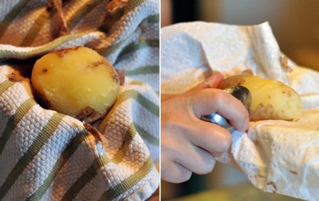 Utiliza una toalla, o servilleta de papel, o una cuchara para frotar o rascar la piel de las papas. Estos pasos anteriores son de tu preferencia. Puedes hacerlo por el método convencional. Pelar las papas, y hervirlas sin piel.