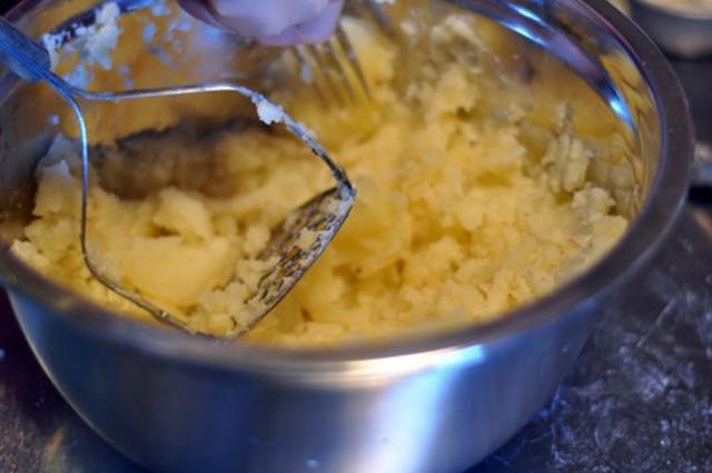 Ahora aplasta las papas para hacer un puré tan fino como sea posible en un tazón grande. Si las papas no quedan perfectamente aplastadas, vas a terminar con una masa grumosa, más rústica, y aún así va a ser delicioso.