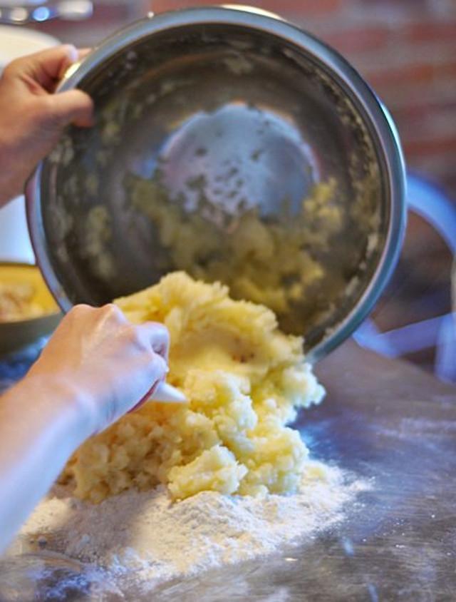 Hay una gran variabilidad en las papas, por lo que sólo tienes que añadir harina hasta que la masa se siente sobre todo suave y ligeramente pegajosa.
