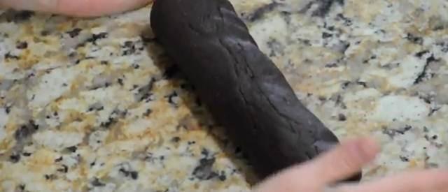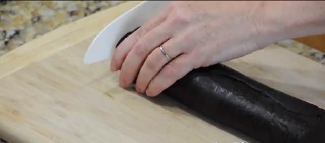 Coloca la masa en la mesada, y con las manos, de manera uniforme, forma la masa en una forma cilíndrica de aproximadamente 25 cm de largo.