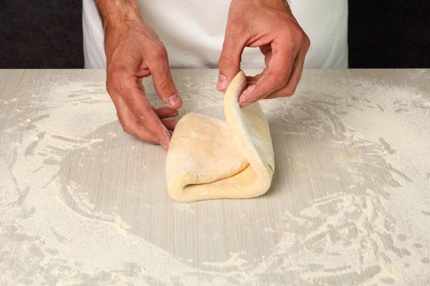 Repite ahora el paso de espolvorear azúcar blanco y dobla de nuevo los extremos de la masa hacia el centro. De nuevo, deberás amasar el hojaldre con el rodillo y conseguir así que el azúcar se integre mejor, y después tendrás que doblar la masa por última vez, pero tan solo colocando un extremo encima del otro.