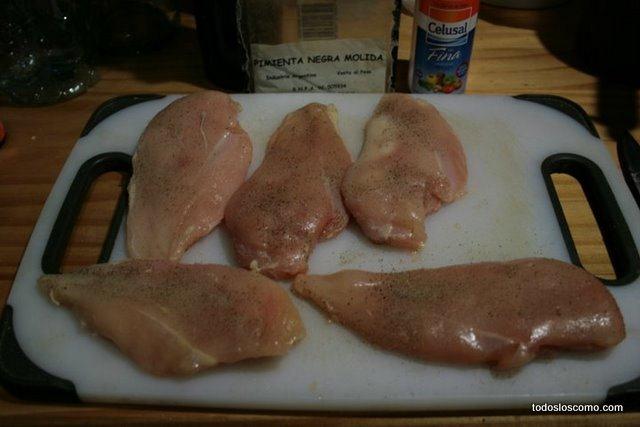 Para empezar a hacer esta receta de pamplonas, cortamos los filetes de pechuga de pollo por la mitas con la ayuda de un cuchillo. Una vez hecho esto, los condimentamos añadiendo la cantidad de sal y pimienta que nos guste.