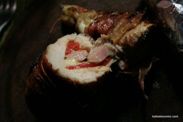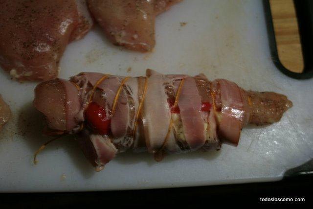 Rellenamos el filete de pollo con el queso, el jamón y el pimiento, luego colocamos la loncha de jamón o panceta a su alrededor y, por último, lo vamos atando con un cordel de manera que todos los ingredientes queden bien sujetos y no se salgan.