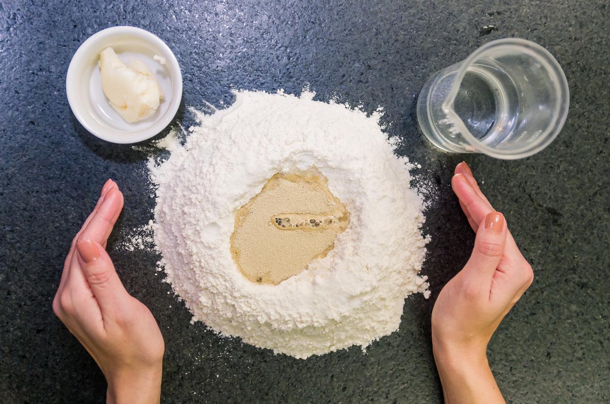En el agujero del volcán deberás añadir la levadura de panadero troceada, así como un poco de agua y la cucharadita de miel o malta. Además, en las paredes exteriores del volcán de harina podrás repartir la sal, de modo que evites que entre en contacto directo con la levadura.