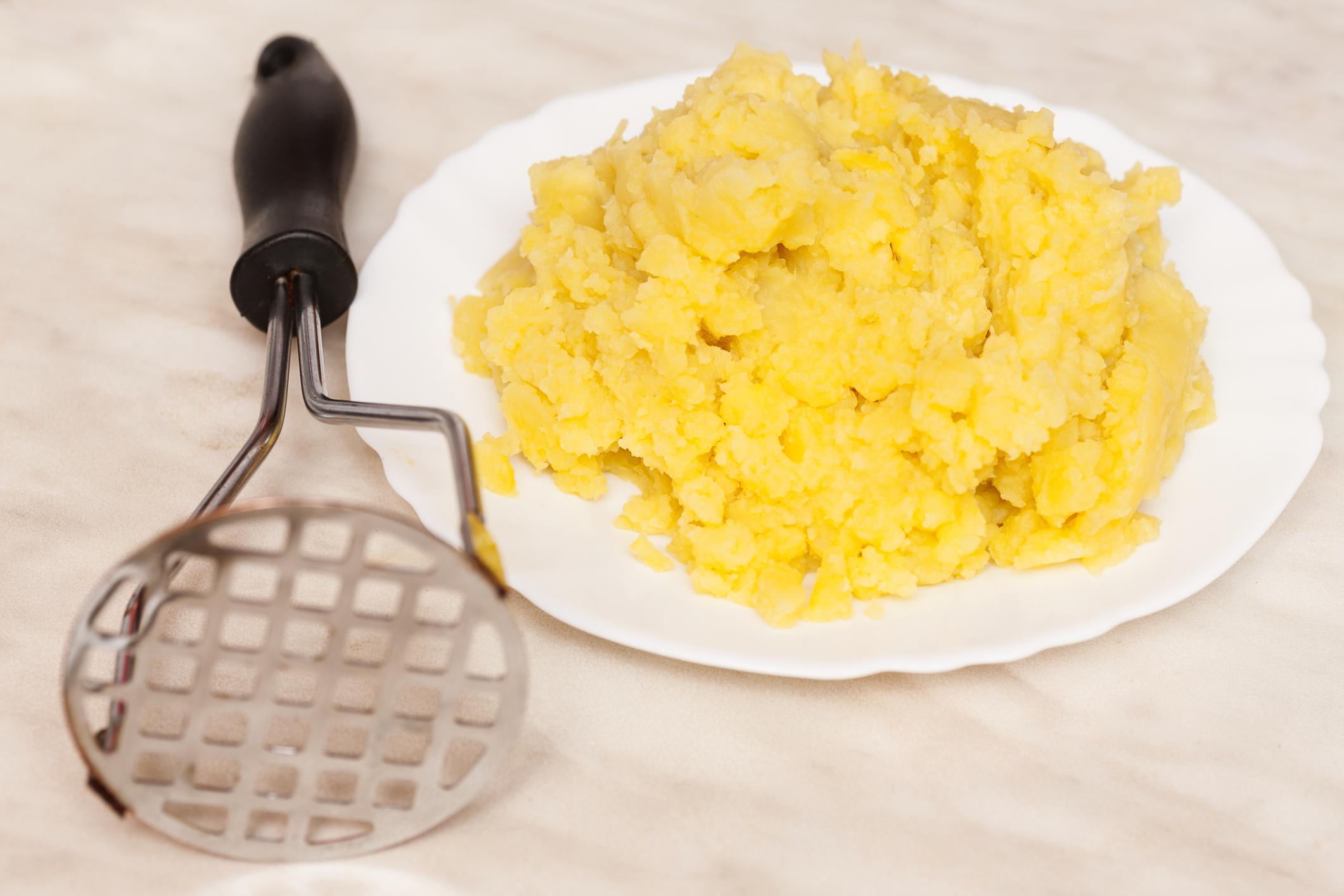 Cuando la patata se haya enfriado, debes pelarla y aplastarla. Utiliza un tenedor o, si dispones de ello, un pasa-purés para que la tarea sea más sencilla. Después, cambia la patata aplastada de bol para continuar con la receta.