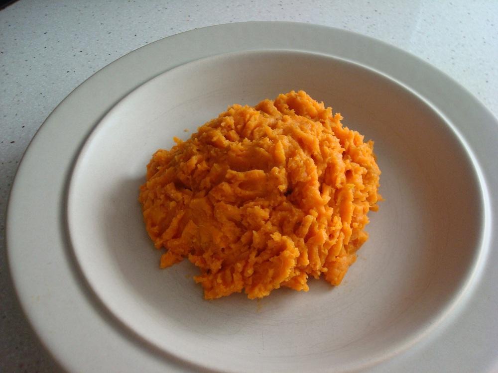Dejar que el boniato se temple (ni frio ni caliente), pelarlo, cortarlo y hacer un puré.
