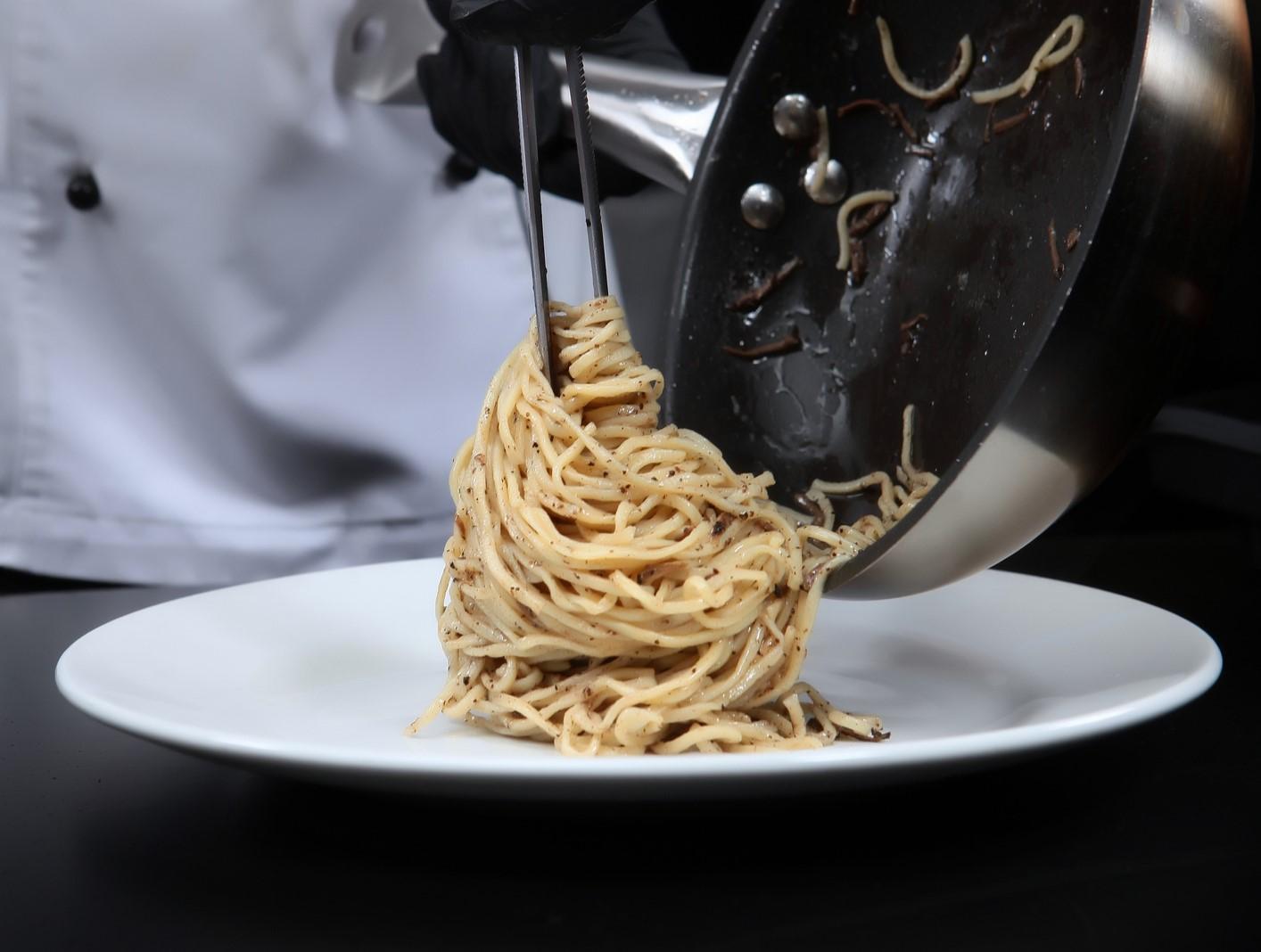 Retirada el agua, vierte inmediatamente en el caldero de la pasta la salsa de trufa y queso parmesano. Remueve ligeramente para repartirla muy bien y para lograr que la pasta se impregne de su aroma y sabor (además el calor, hará que las yemas queden hechas y que el queso se funda perfectamente con la nata).