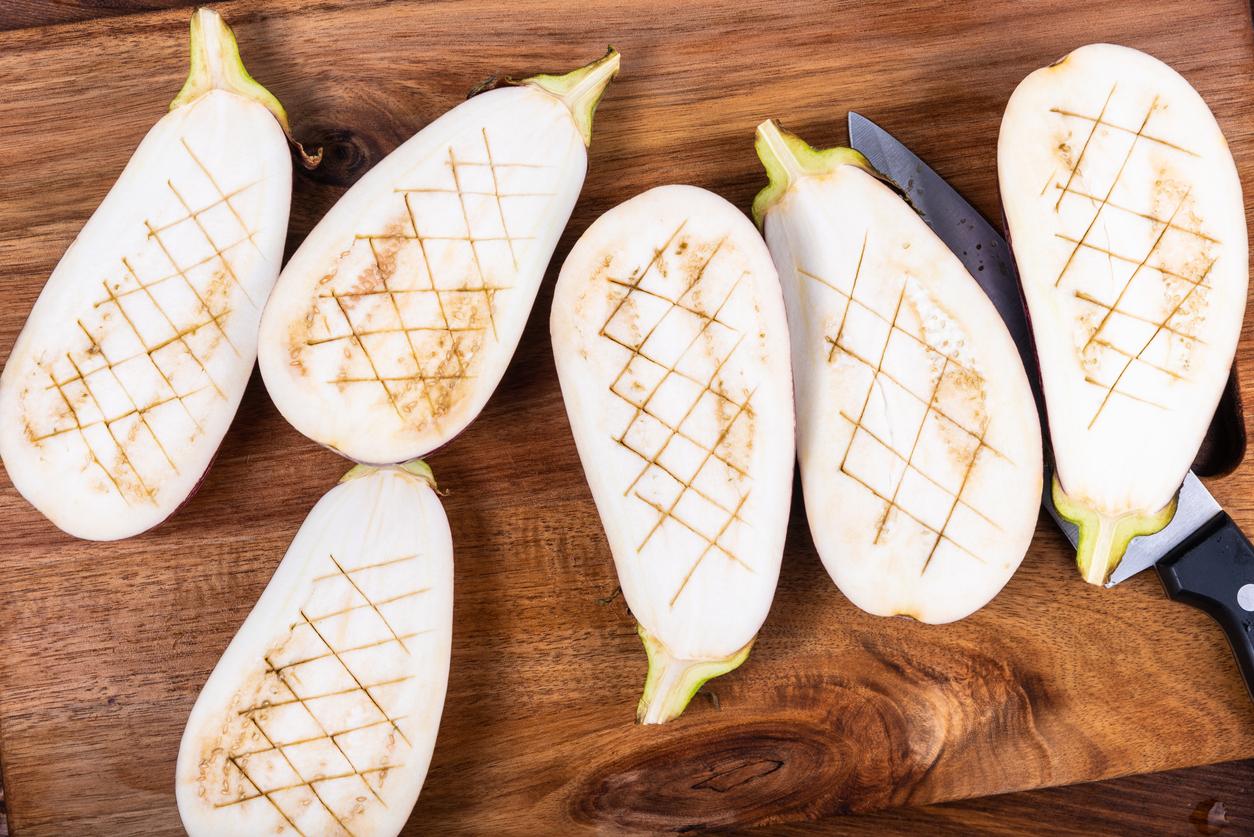 Mientras precalientas el horno a 200 ºC, prepara las berenjenas para asar. Para ello, lávalas muy bien y córtalas por la mitad. Puedes dibujar cuadritos o líneas con el cuchillo para acelerar la cocción.