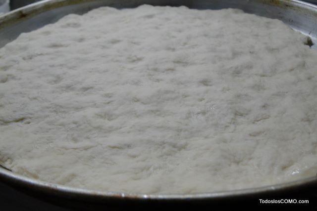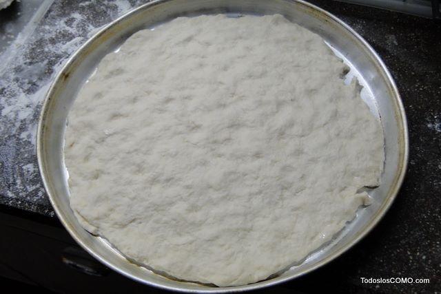 Una vez que notamos que la masa está lista aceitamos una pizzera y ponemos el bollo sobre la misma. Si vas apretando el bollo contra la pizzera la masa se irá achatando hacia los bordes. La idea es que siga manteniendo la forma circular y la masa de pizza quede como esta (o más bonita en los bordes).