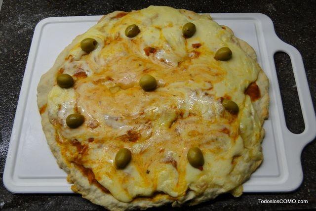 Sacamos la pizza del horno y ponemos las aceitunas. Aquí depende si el cocinero gusta de las aceitunas frías o calientes para meter la pizza por 2 minutos más en el horno.