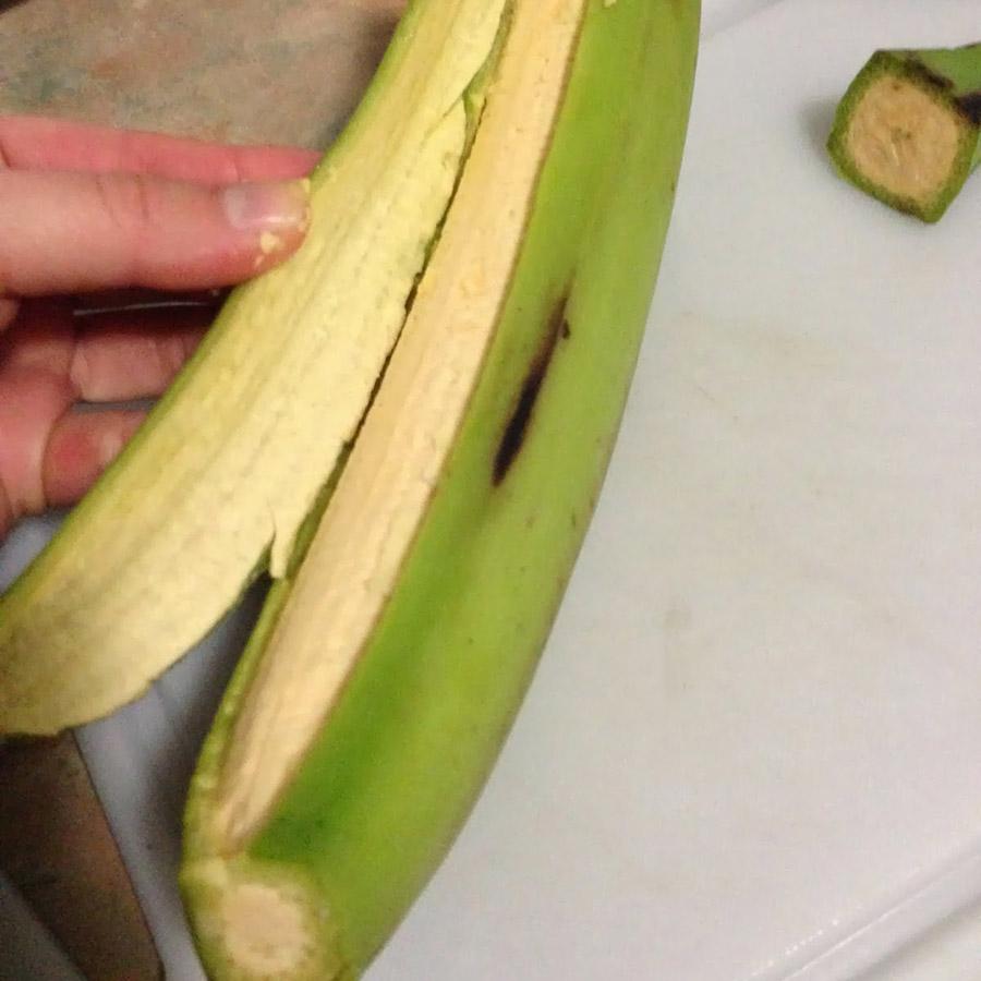Lo primero que debes hacer es pelar los plátanos. Para ello, corta las dos puntas y, con un cuchillo, realiza cortes verticales para retirar toda la cáscara sin problemas. Lo ideal es que los plátanos sean verdes, pero si solo dispones de maduros no te preocupes, también puedes cocinarlos.
