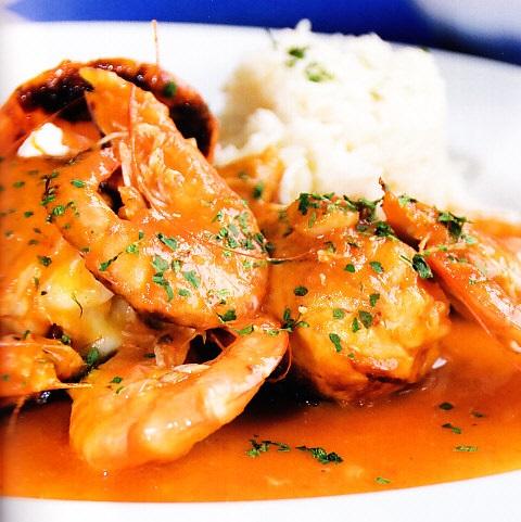 Por último, comprueba que el sofrito de tomate y cebolla está preparado, y echa junto a él en la cazuela el pollo y la picada. Deja que el alcohol del coñac se evapore durante unos 3 minutos y, luego, cubre todas las porciones de pollo con el caldo de pescado. Tapa la cazuela y deja que se cueza durante al menos 30 minutos. Transcurridos estos minutos, comprueba el punto de sal y rectifica si es necesario. Ahora, será el momento de agregar las gambas y dejar cocer por unos 5 minutos más y, tras dejar que repose un poco, tu pollo con gambas estará listo para emplatar y servir. ¡Buen provecho!