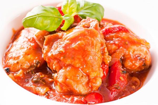 Deja que la salsa de tomate se cocine unos segundos a fuego lento y, seguidamente, introduce el pollo, el caldo de pollo y el vaso de vino blanco. Deja que estos se reduzcan un poco y, luego, sitúa el fuego a una temperatura media para que todo se termine de cocinar durante unos 15 o 20 minutos y el pollo esté lo suficientemente tierno. Comprueba que las porciones de pollo quedan bien impregnadas en la salsa para que el resultado final sea el esperado.