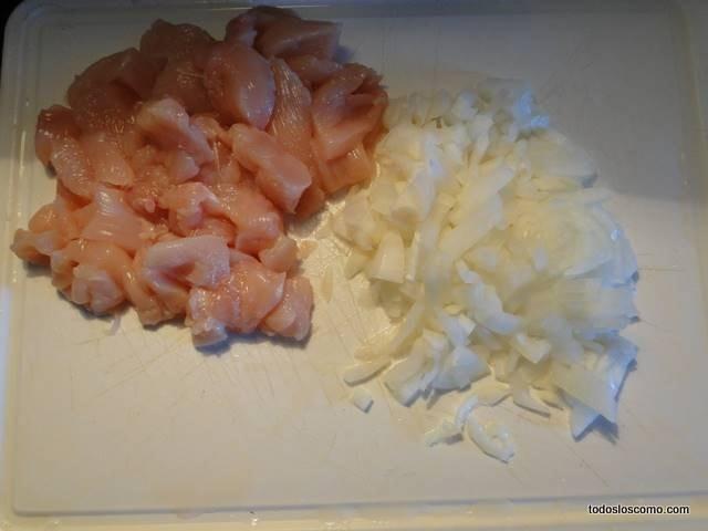 Cortamos el pollo en cubitos de 1 cm de lado y picamos la cebolla como en la imagen.