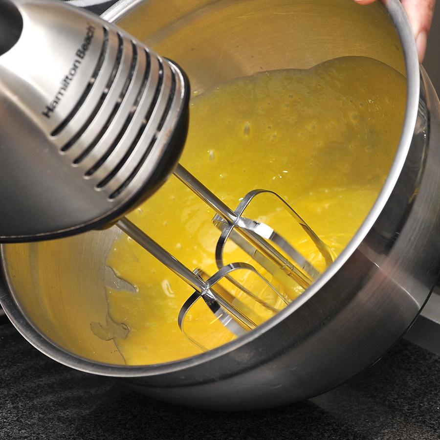 Mientras se disuelven los ingredientes a fuego lento, bate la yema de huevo hasta que adquiera una textura espumosa y añádela a la mezcla. Deberás remover constantemente la masa del pudin de vainilla hasta que se espese por completo, puede que te lleve unos minutos.