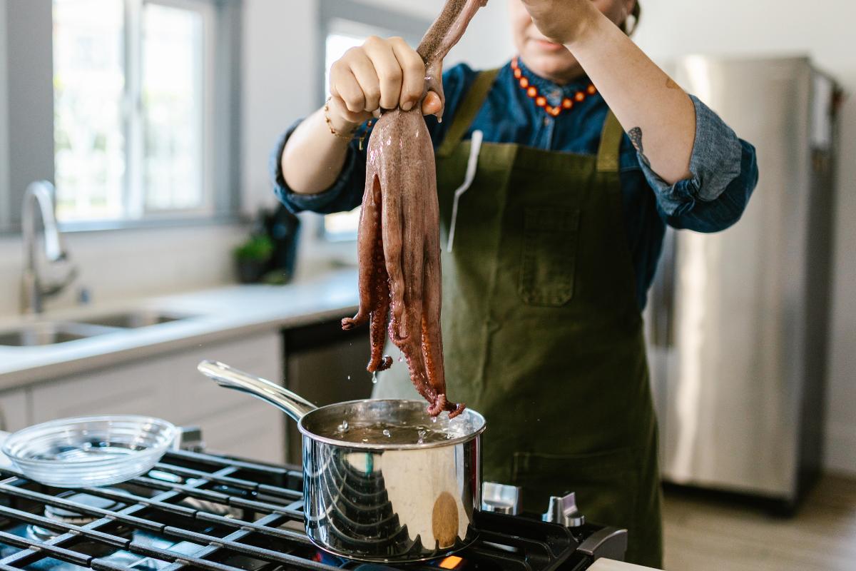 Pincha la parte más gruesa de los tentáculos con un palillo o un cuchillo para comprobar si está tierno. Si el utensilio entra fácilmente, el pulpo está listo.