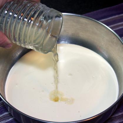 Para hacer queso de untar casero, cuando la mezcla esté caliente, sin llegar a hervir, apaga el fuego pero no retires la olla. En una taza, disuelve el cuajo en polvo con un poco de agua y añádelo a la mezcla.