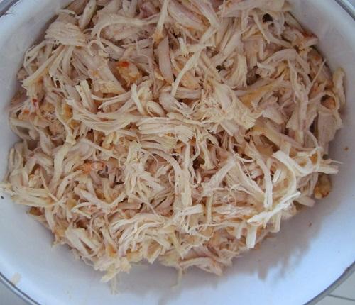 Deja que se cocine y, una vez que se encuentre listo, cuela el agua conservando un poco de caldo y deja que el pollo se enfríe un poco. Luego deberás desmechar el pollo retirando los huesos y la piel, mientras mejor desmechado esté más sabrosa quedará la reina pepiada.