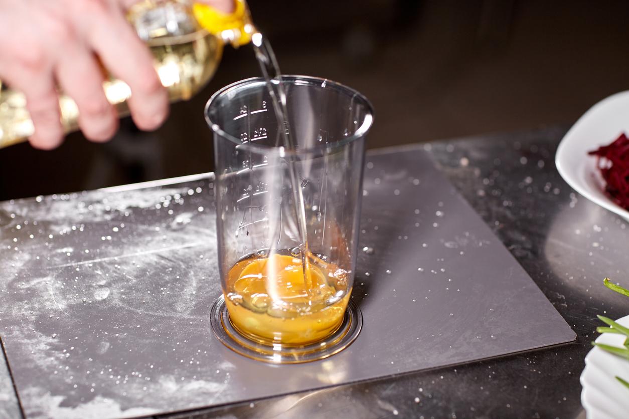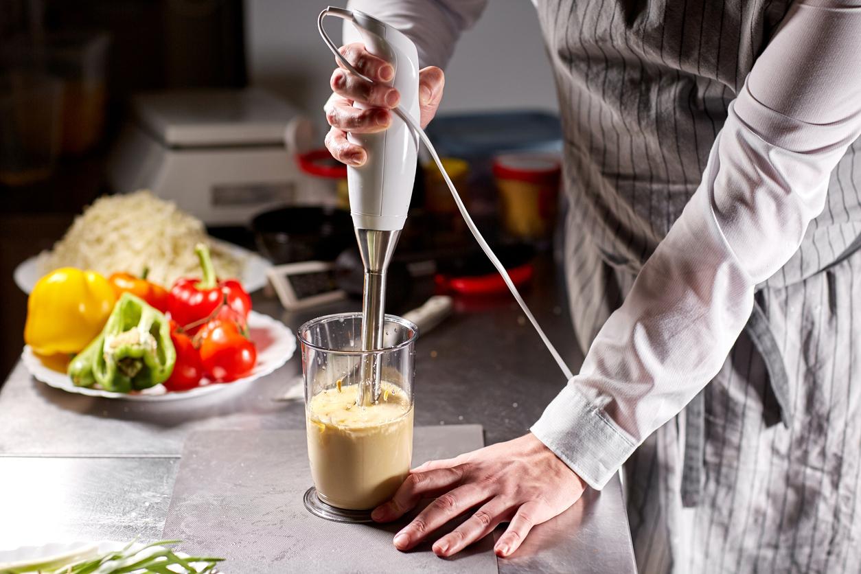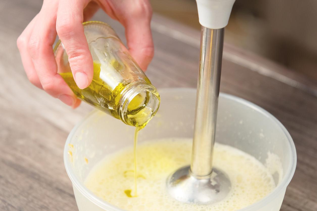 Ya están todos los ingredientes en el mismo recipiente, así que puedes comenzar a batir. Para ello, introduce la batidora hasta el fondo del recipiente, en contacto con el plástico o el cristal y presiona el botón para encenderla. ¡Ojo! No la pares hasta terminar: mantén el botón presionado hasta que la mezcla se emulsione. Cuando esto suceda, notarás que adquiere una textura más cremosa y se vuelve blanca.