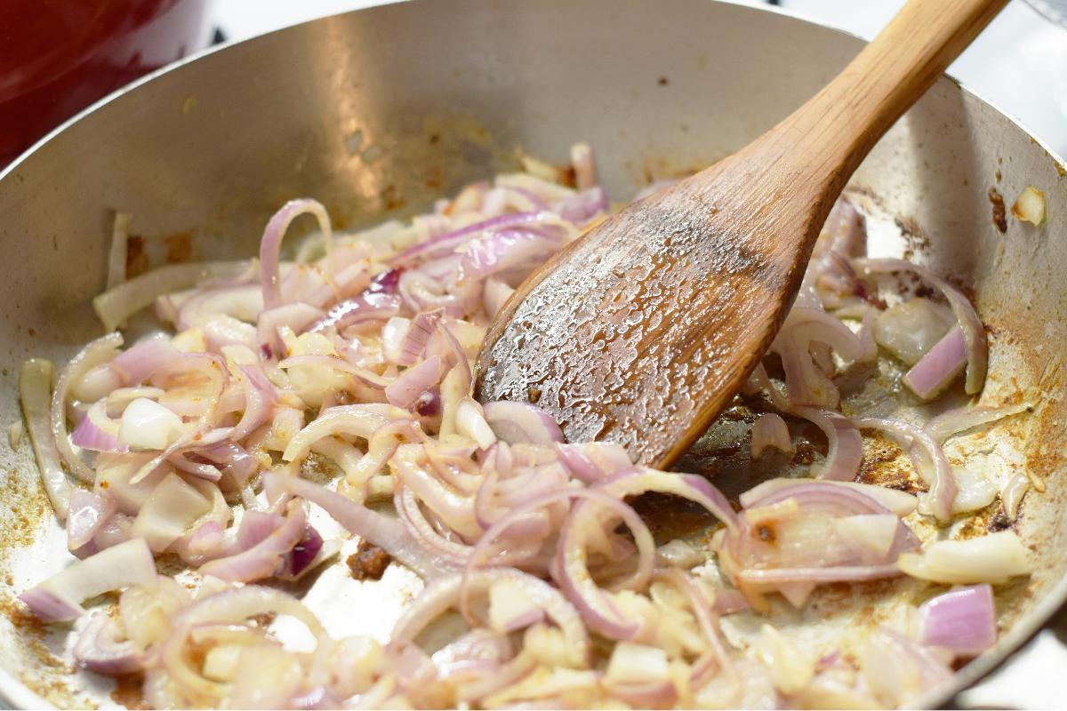 Añade la chalota y el ajo, y sofríe durante 3-5 minutos hasta que estén tiernos y ligeramente dorados. Pon atención y hazlo a fuego medio para que no se termine quemando la mantequilla, sino que vaya envolviendo los ingredientes.