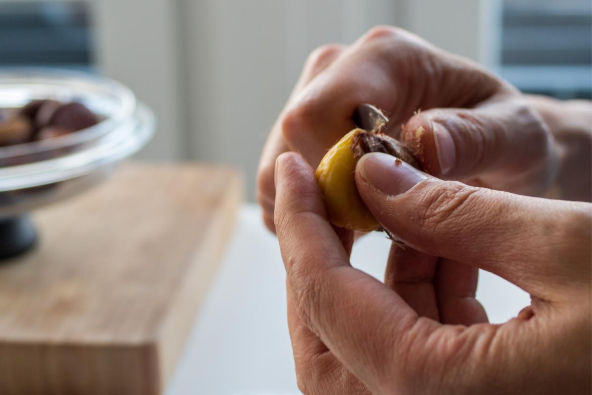 Si utilizas castañas frescas, hazles un pequeño corte en la piel con un cuchillo afilado y hiérvelas en agua con una pizca de sal durante 15-20 minutos. Luego, pélalas cuidadosamente mientras aún estén calientes, retirando tanto la piel dura como la fina. Si usas castañas cocidas envasadas, simplemente escúrrelas y enjuágalas antes de usarlas.