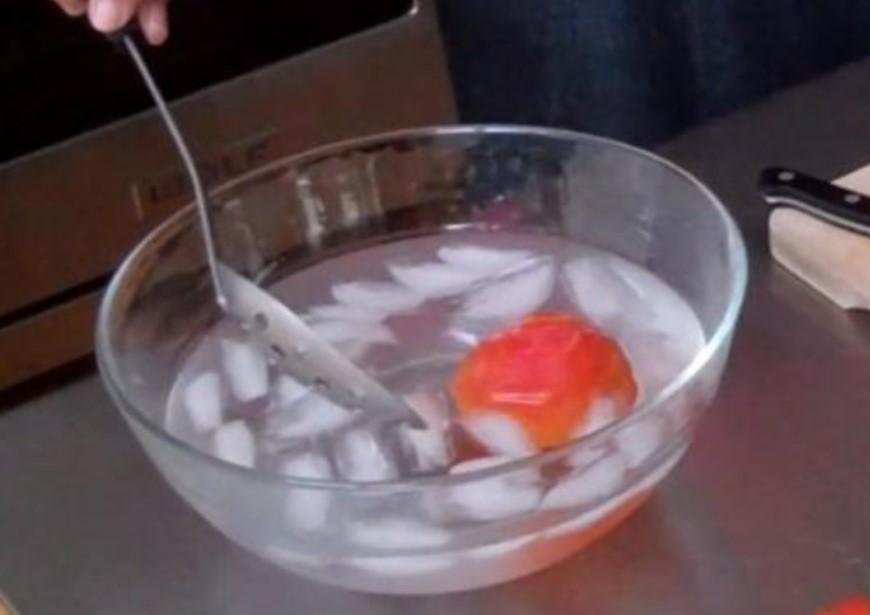 Deja que los tomates hiervan durante 1 minuto, los sacas de la olla y los colocas en un recipiente lleno de hielos para que los tomates se enfríen rápido. Cuando ya estén fríos, podrás pelarlos fácilmente y sin riesgo de quemarte.