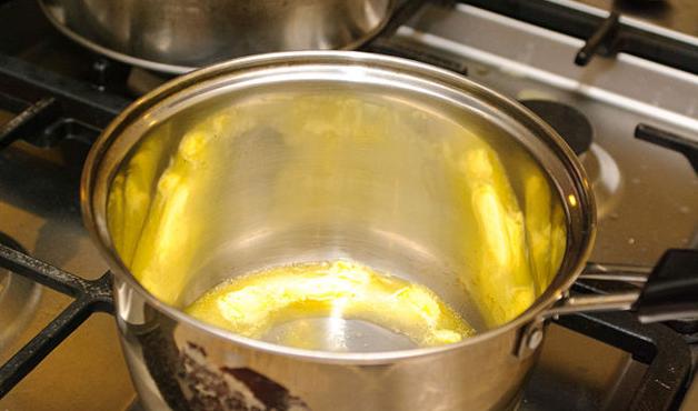 Pon a fuego lento en una olla unas 3 cucharadas de mantequilla. Déjala que se derrita completamente. No pongas mucho fuego porque la mantequilla se evaporará y la salsa de vinto tinto pederá untuosidad.
