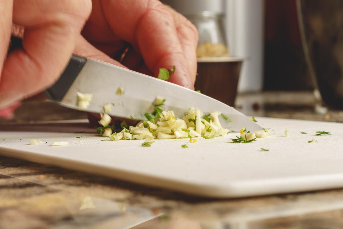 A continuación, prepara el aliño: pela y pica finamente los dientes de ajo y el perejil.