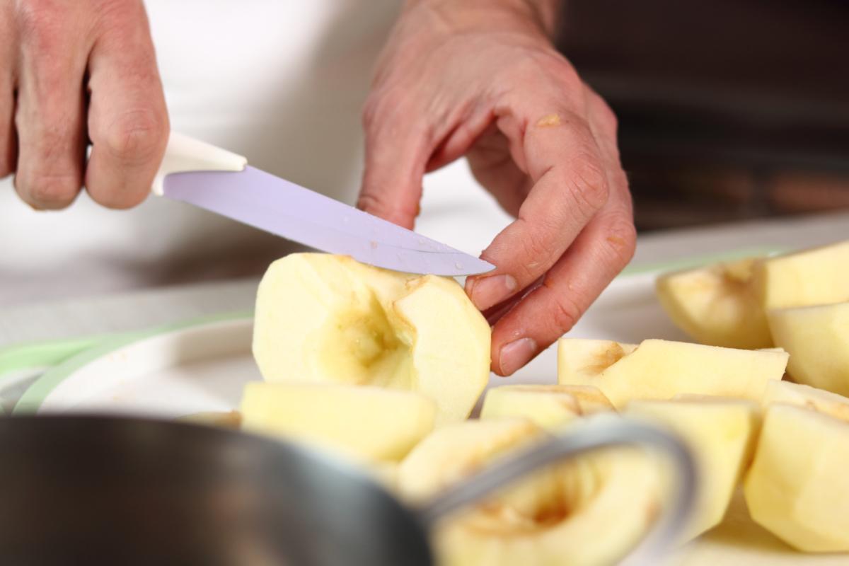 Corta las manzanas en trozos pequeños y uniformes para facilitar el proceso de triturado y obtener una mezcla homogénea.