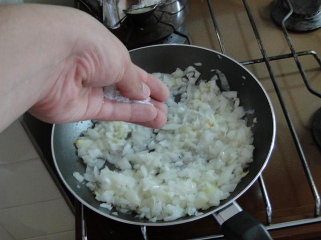 Cuando veas que la cebolla comienza a soltar agua y suavizarse, es el momento de echarle sal y pimienta a gusto para comenzar a añadirle sabor a esta receta de tarta de jamón y queso.