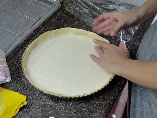 Mientras se sigue dorando la ceboliita, comenzamos a poner la tapa de pascualina en una fuente para tartas, en caso de no tener una puedes usar una fuente para pizzas. Como ves la fuente para tartas es genial porque es alta y permite que los bordes estén bien levantados.