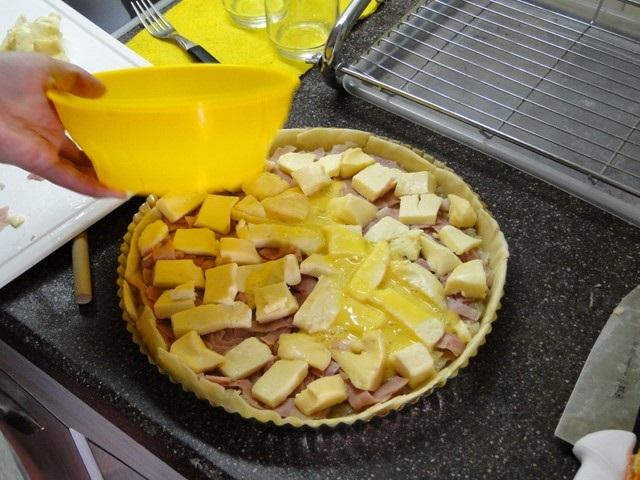 Bate el huevo en un bol y se lo echas la tarta, el huevo agrega consistencia al relleno para que no se romp" tan fácilmente una vez que cortamos las porciones. Ahora sí, tu tarta de jamón y queso ya está lista para ir al horno por unos 20 minutos.