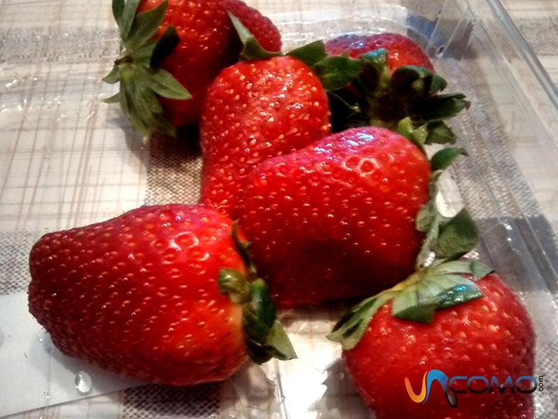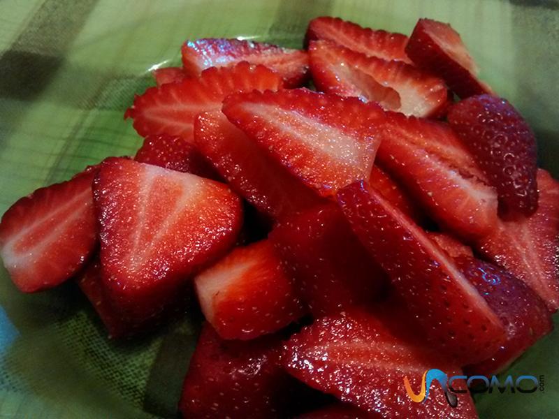 Seguidamente, deberás quitar el pedículo de las fresas, es decir, la parte verde que incluye unas pequeñas hojitas y el tallo. Asimismo, deberás cortar las fresas de forma transversal, de arriba a abajo y reservarlas.