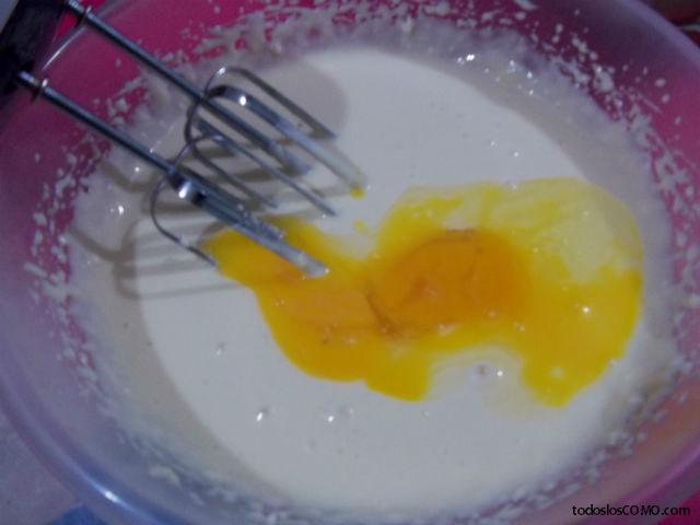 Reserva el molde y, en otro recipiente, pon el queso y la leche condensada. Mezcla ambos ingredientes con una batidora eléctrica hasta que no queden grumos y, una vez esté lista, añade los huevos y bate un poco más para que todo se una.