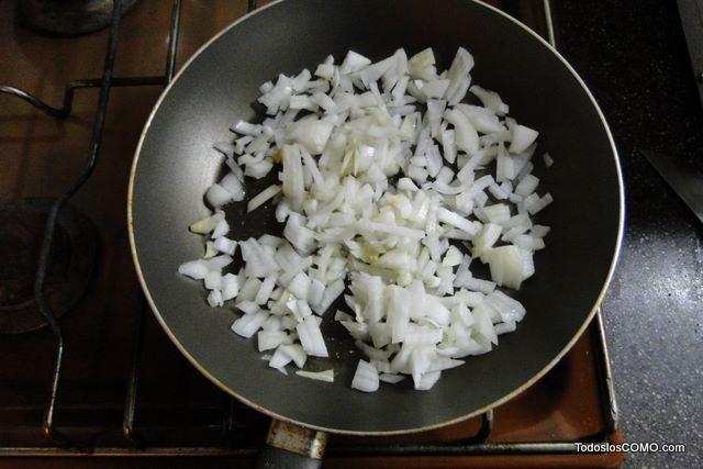 Ponemos la cebolla en un sartén con un poco de aceite y doramos a fuego medio.