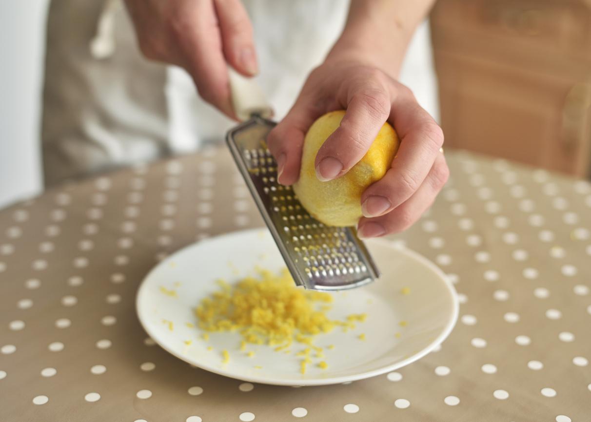 Con un pelador o rallador, coge un limón y ralla la cáscara hasta sacar virutas de la piel que le darán un toque fresco y cítrico. Cuando tengas el equivalente a una cucharadita, añádelo a la mezcla de huevos y azúcar y mézclalo todo para que tome aroma.