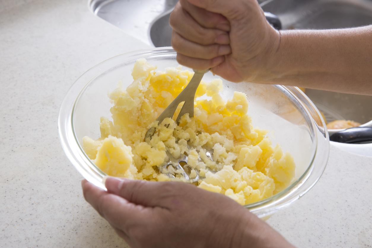 Una vez las patatas cocidas se hayan enfriado por completo, pélalas y machácalas hasta hacerlas puré. Puedes ayudarte de un tenedor.