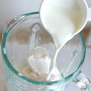 Coge un recipiente de borde alto y añade el helado y la leche, bátelo todo a velocidad media. Si dispones de licuadora también puedes mezclar los ingredientes ahí. Luego, incorpora el azúcar poco a poco y sin dejar de batir.