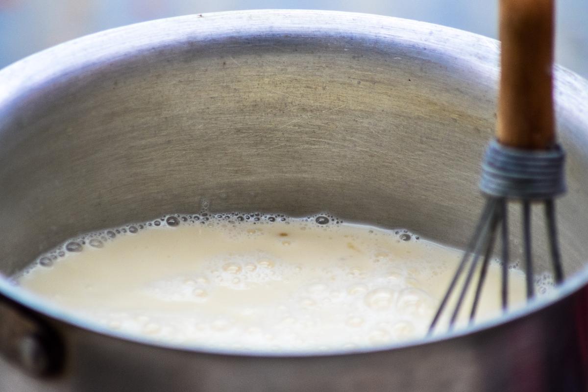 Con todos los ingredientes mezclados, deberás llevarlos a ebullición suave entre 1 y 2 minutos, removiendo constantemente, hasta que notes que la base de este flan de turrón blando empieza a espesar.