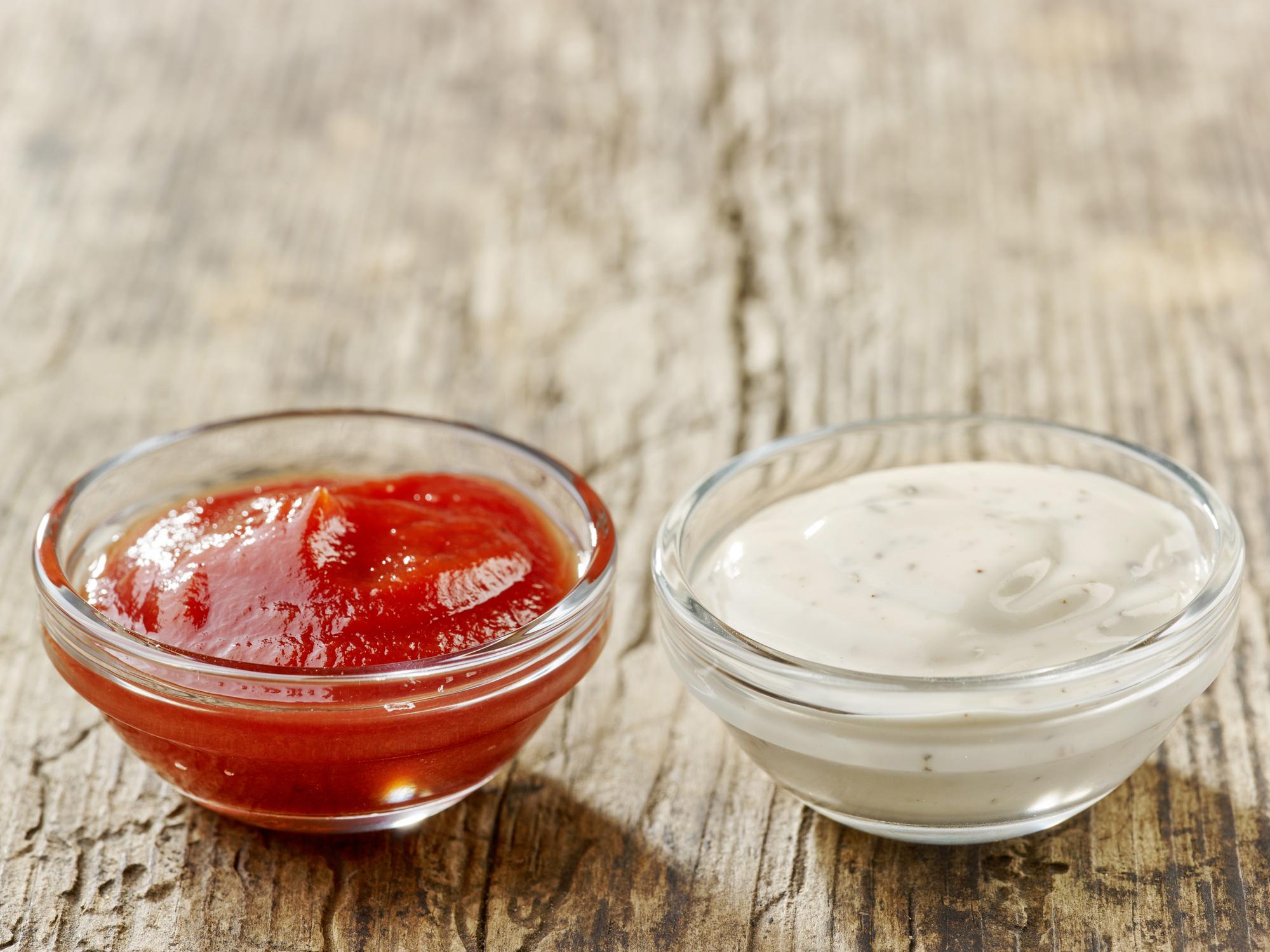 Para hacer la salsa roja, mezcla los ingredientes indicados para su elaboración, es decir, la salsa de tomate, el tomate concentrado, comino molido, pimienta negra molida y el orégano seco. Utiliza una túrmix para hacer bien la mezcla.