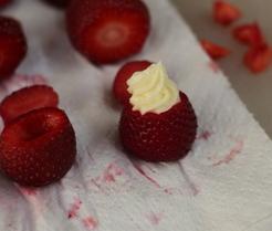 Una vez ya tienes la nata en la manga, rellenaremos las fresas con nata, cuidado no la llenes mucho ni poco fíjate en la imagen, de como debe quedar.