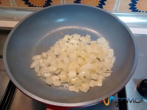 Mientras, pon una sartén al fuego con dos o tres cucharadas de aceite de oliva y, una vez que esté bien caliente, añadimos el ajo y la cebolla debidamente salada. Deberemos mantener el fuego al mínimo para que la cebolla se cocine lentamente, y será importante ir removiéndola con una cuchara de madera para que no se pegue o se queme. No será necesario que la cebolla se dore por completo, sino que se trata de conseguir que quede transparente.