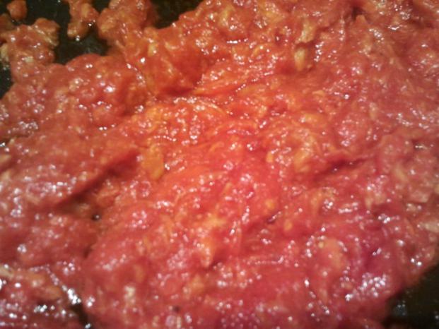 Si optamos por usar tomates naturales maduros para hacer el sofrito de los espaguetis, será necesario pelarlos y trocearlos, mientras que si nos decantamos por el tomate triturado de compra nos ahorraremos este paso. Una vez que la cebolla esté bien pochada, añadiremos a la sartén el tomate a trozos o ya triturado; puedes subir un poco el fuego, pero vuelve luego a bajarlo para evitar que se queme el sofrito.
