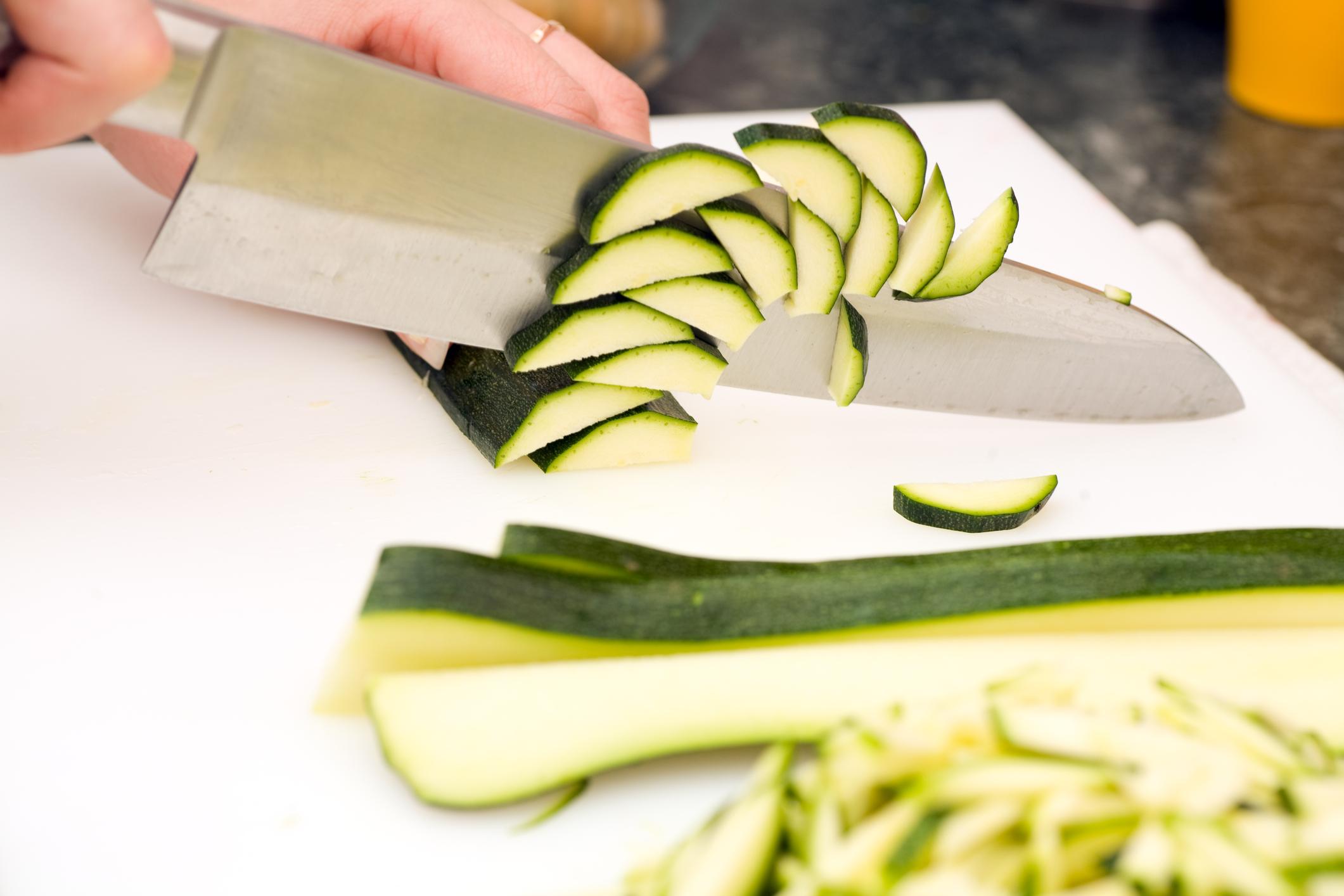Mientras las hortalizas se ablandan en la sartén, corta el calabacín en dados muy pequeños y, después, añádelos a la sartén para que se cocinen con el resto de ingredientes.