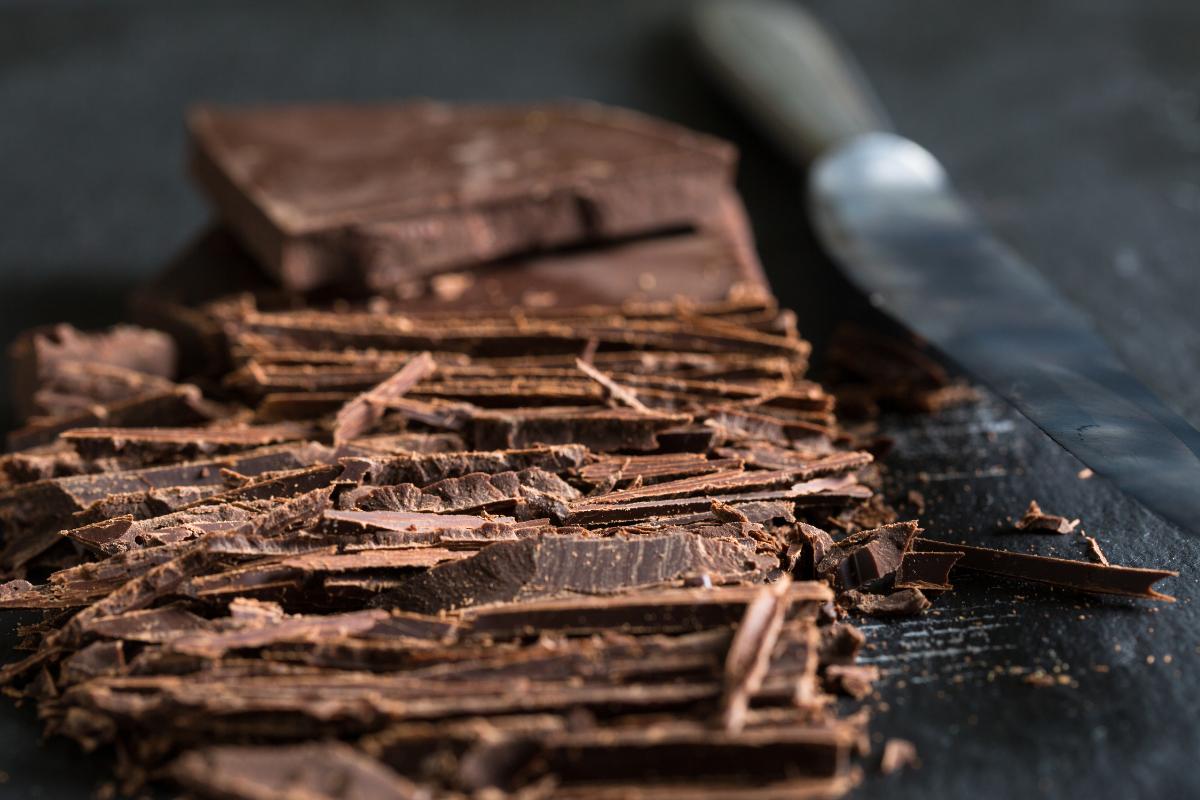 Mientras la masa reposa, trocea el chocolate negro en pedazos pequeños con ayuda de un cuchillo afilado.