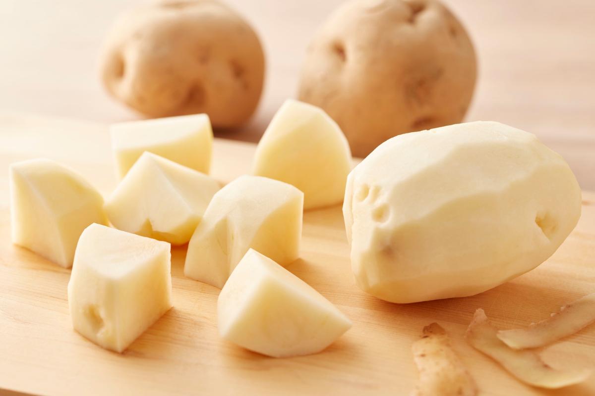 El primer paso de esta receta de ensalada mimosa fácil es pelar y cortar las patatas, la zanahoria y la cebolla. Corta las patatas en dados pequeños. Después, llena una olla con agua abundante e introduce las zanahorias y las patatas troceadas.
